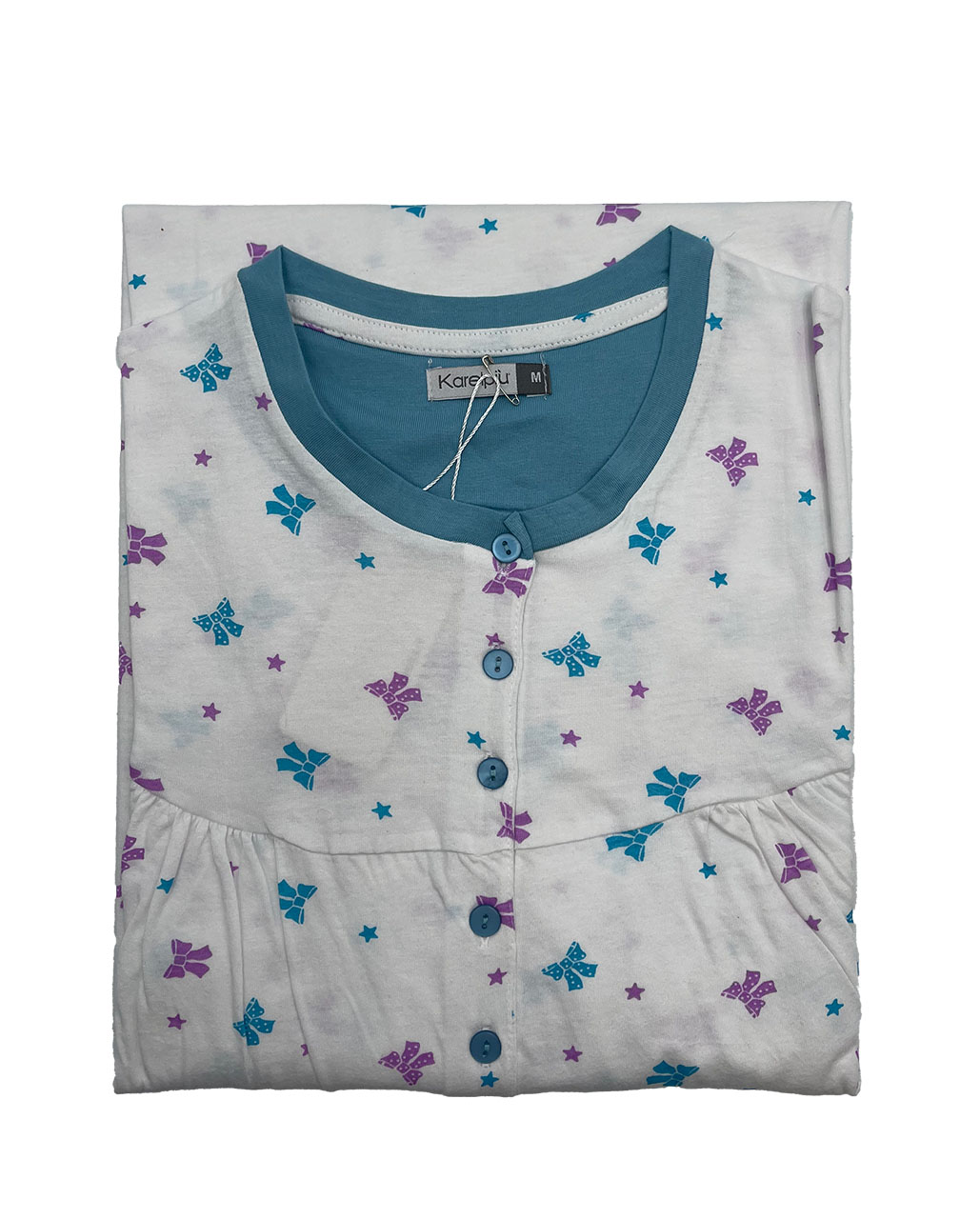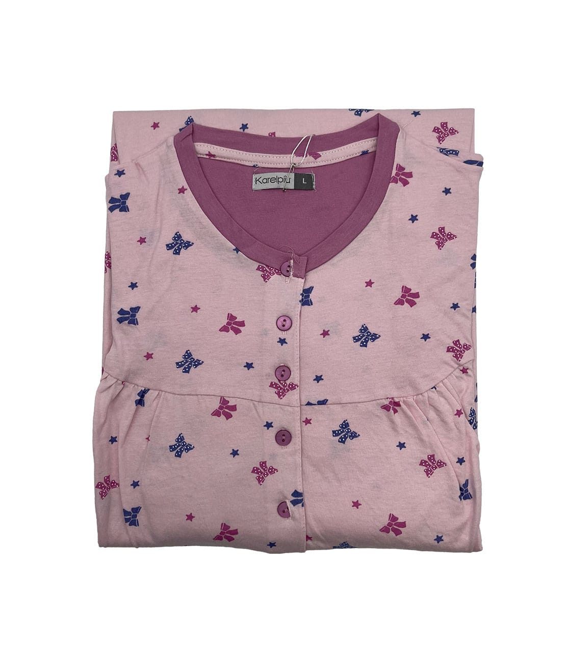 Camicia da notte donna manica corta Karelpiù KE0102CC è un capo ideale per chi desidera comfort e leggerezza durante il riposo, perfetto tra le camicie da notte estive.