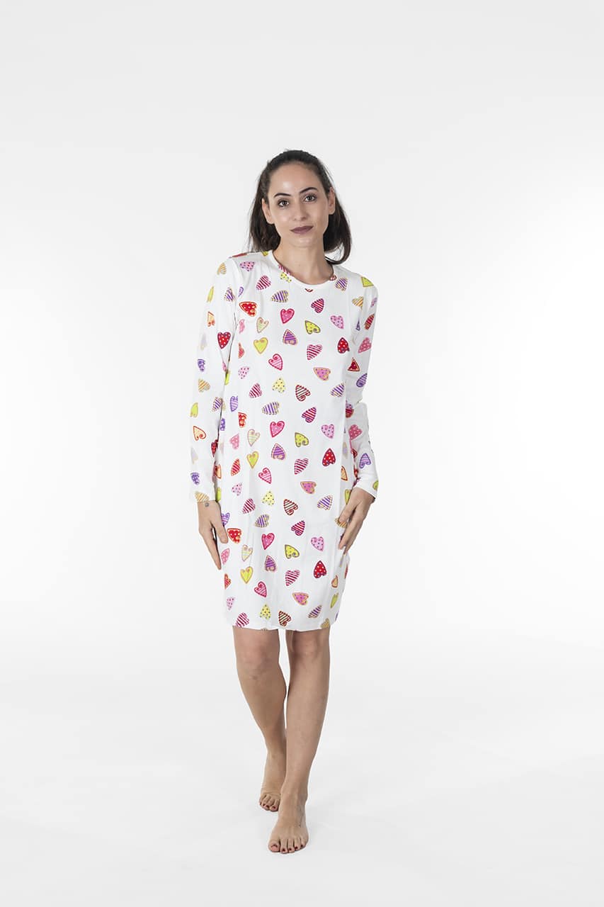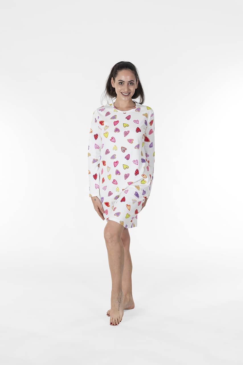 La stampa vivace a cuori colorati su fondo bianco dona un tocco giovane e divertente, perfetta per chi cerca un capo originale anche per la notte.