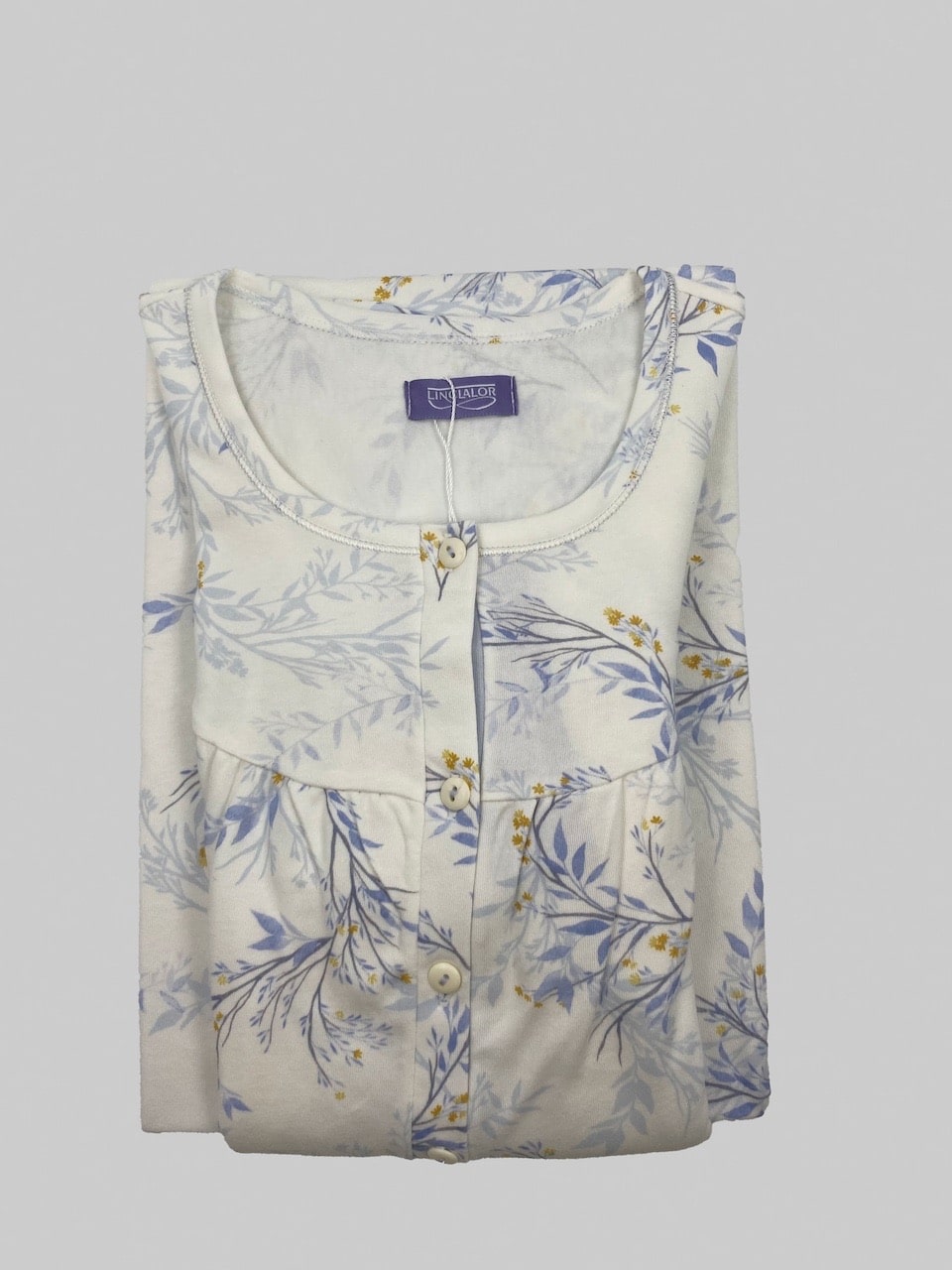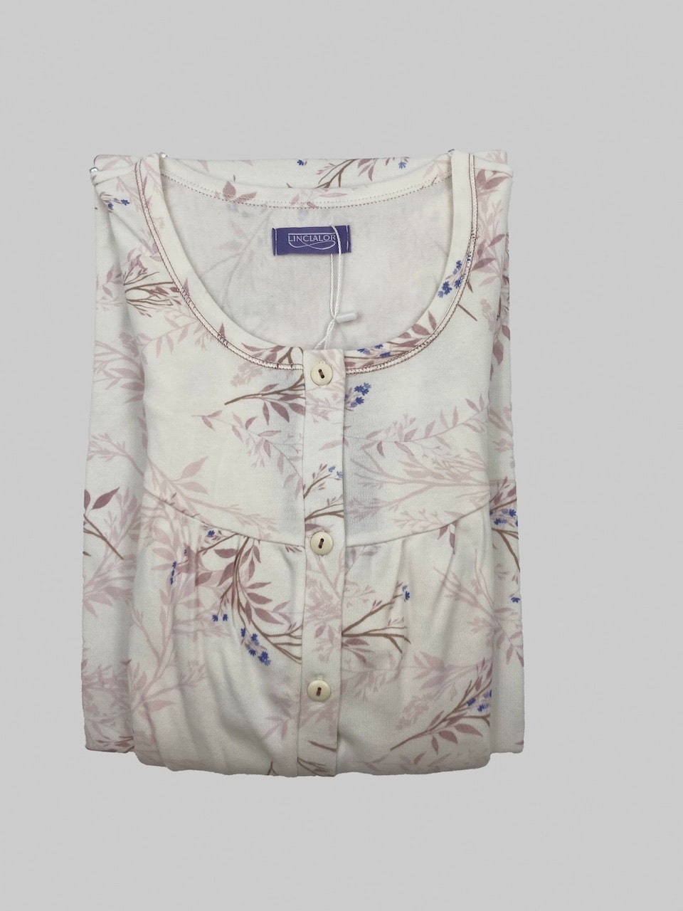 La camicia da notte manica lunga caldo cotone Linclalor LR292232 è in cotone, leggera e fresca, con fantasia floreale, forma seno e bottoncini sul davanti.