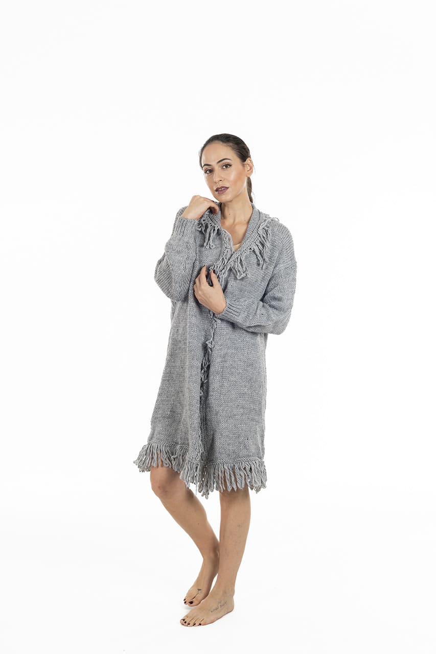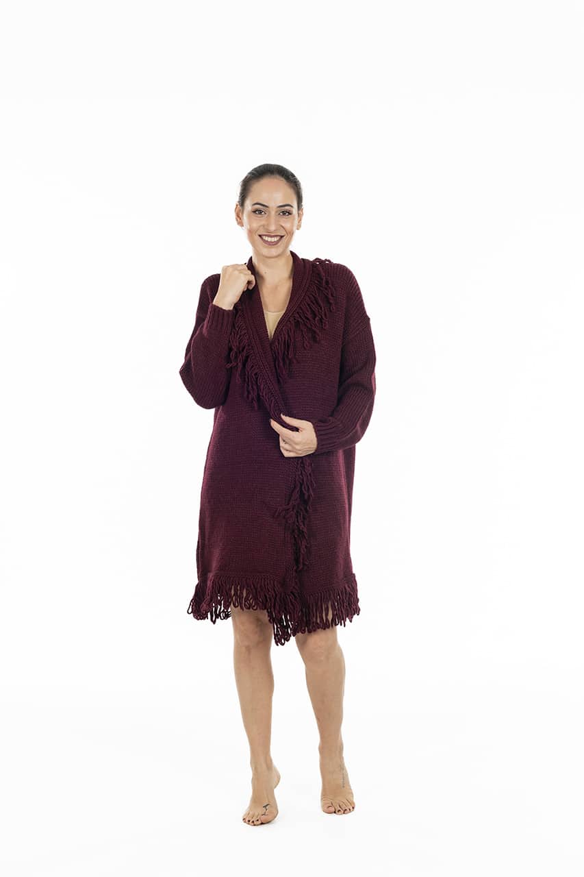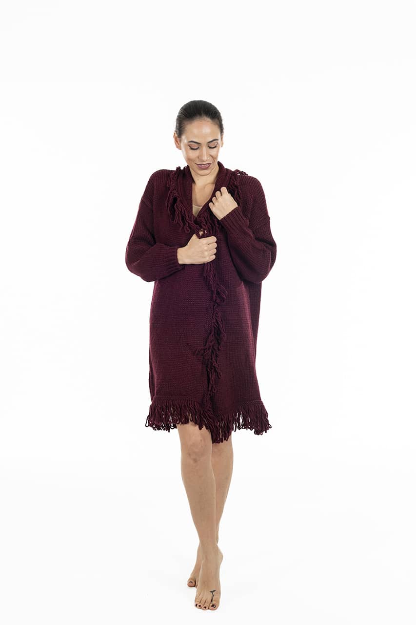 La lavorazione a maglia dona al capo un aspetto artigianale e curato nei dettagli, mentre le frange aggiungono un tocco moderno e originale.