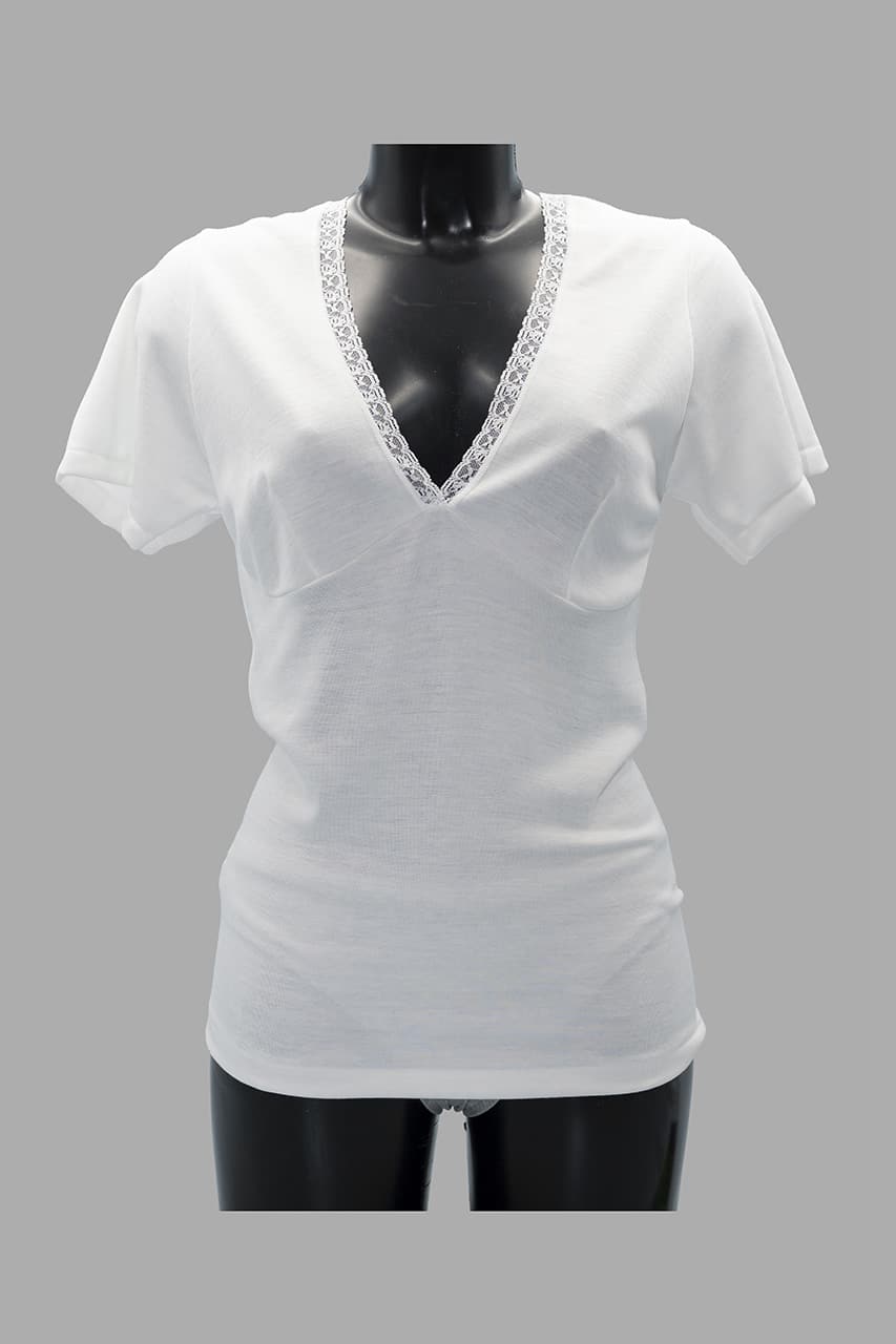 Maglia intima donna Rosanna in lana e cotone con forma del seno e pizzo. Made in Italy, calda e confortevole.