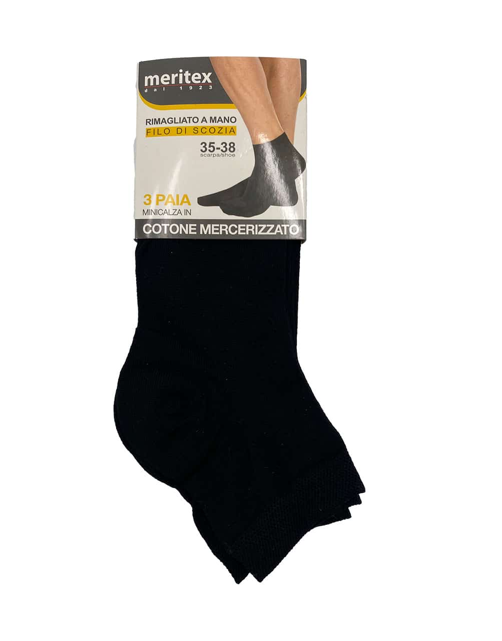 Mini calza Meritex in filo di Scozia, rimagliata a mano. Confezione da 12 pezzi, colore nero, ideale per comfort e uso quotidiano.