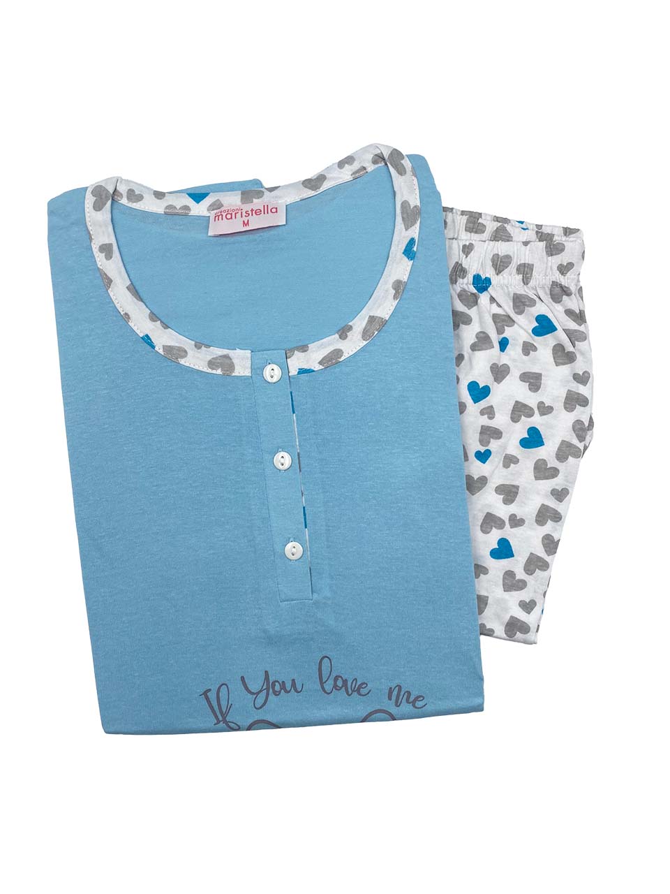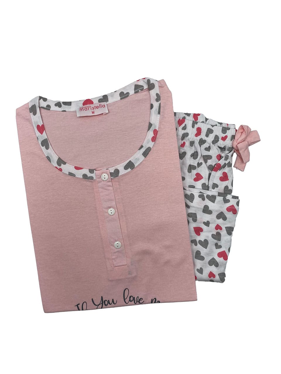 All’interno della categoria dei pigiami donna, si distingue per la stampa grande frontale e i pantaloncini decorati con cuori coordinati.