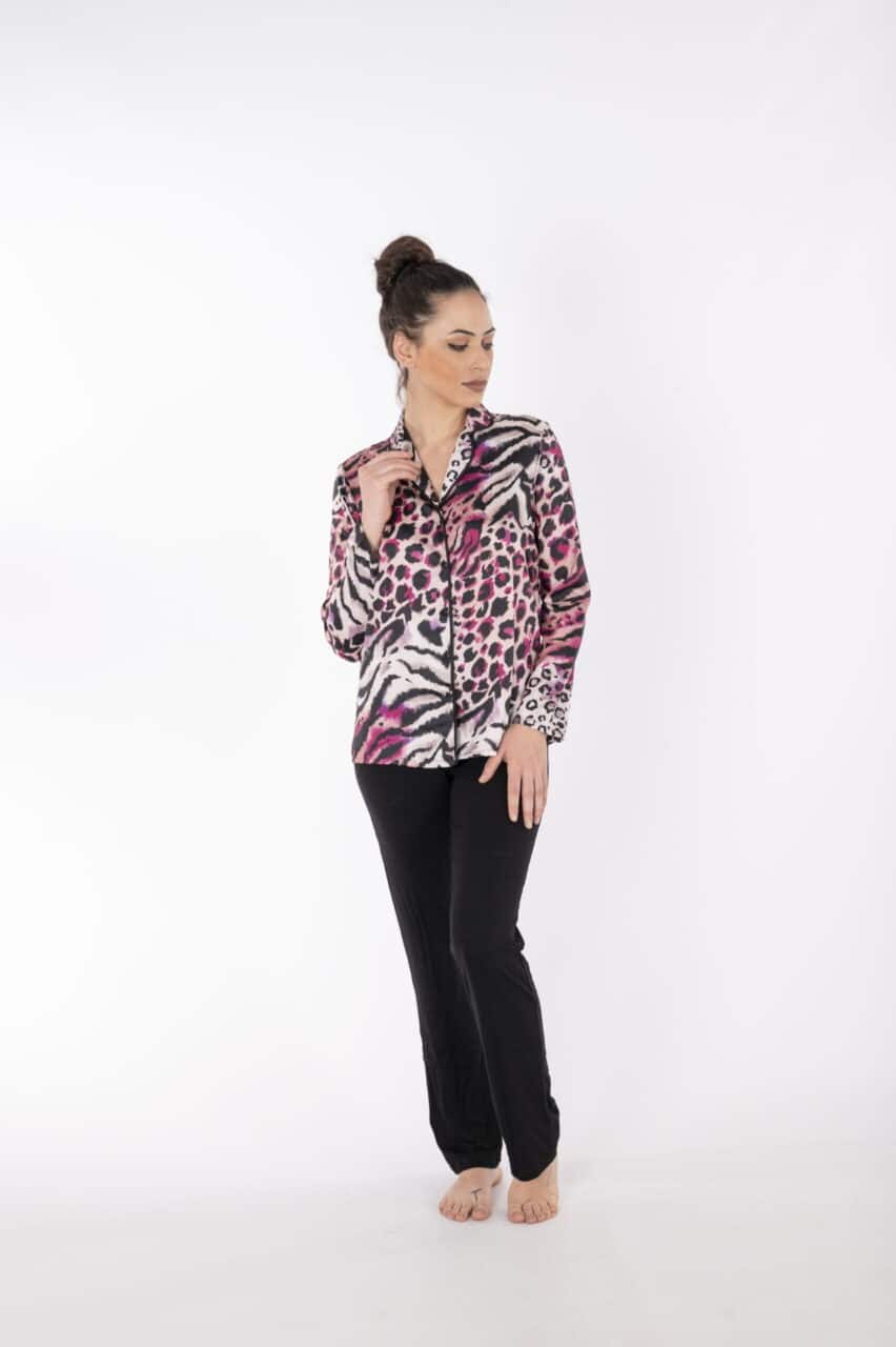 Pigiama donna aperto davanti estivo Andra 9173: ideale per chi cerca un pigiama comodo e alla moda, perfetto per affrontare le calde notti estive. Realizzato in morbido cotone, questo pigiama garantisce freschezza e leggerezza, rendendo il riposo più confortevole. Il design aperto davanti con taglio maschile assicura praticità, mentre la casacca con fantasia animalier aggiunge un tocco audace e sofisticato.