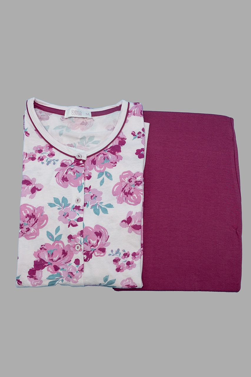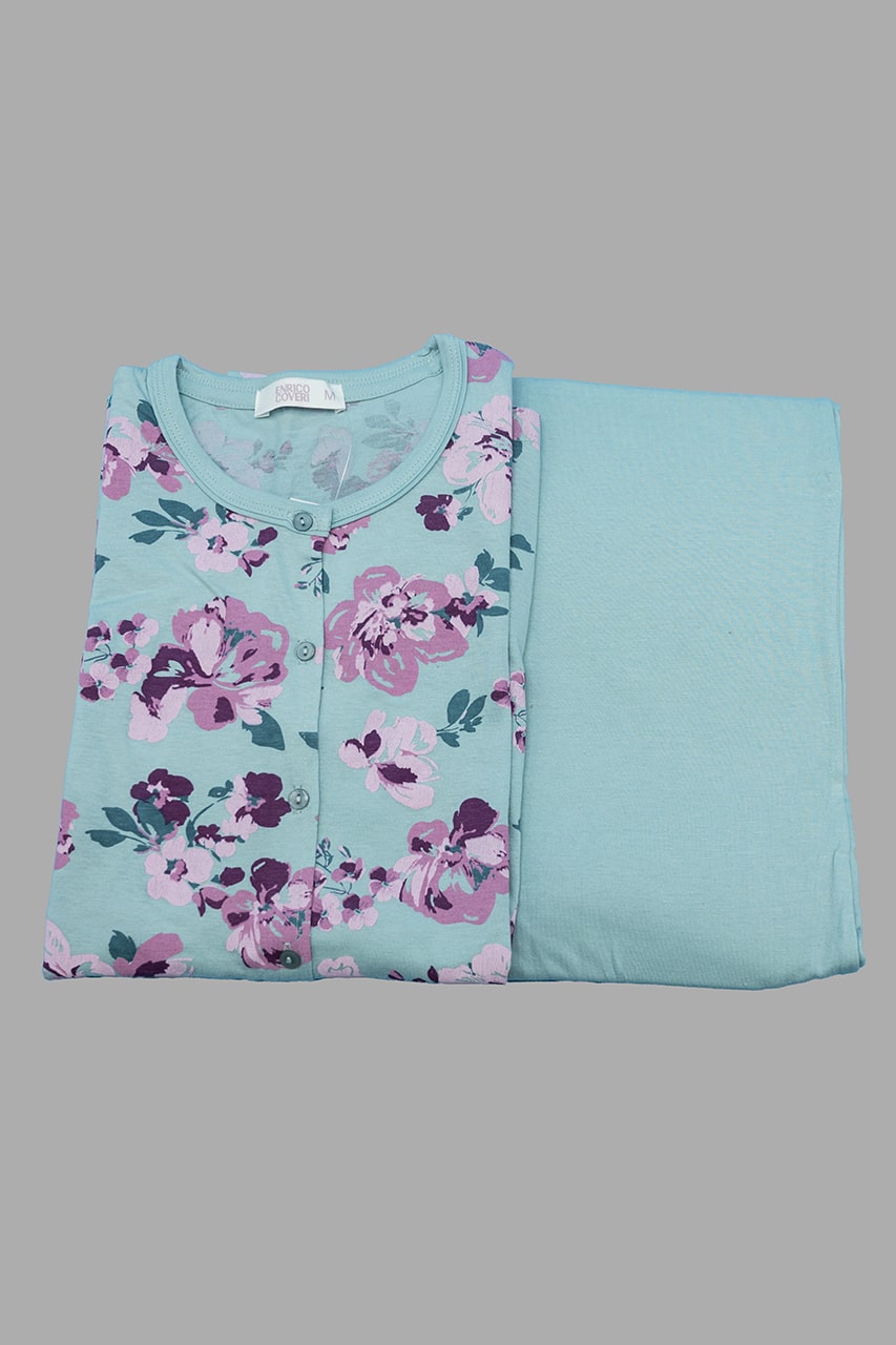 Pigiama donna aperto davanti estivo Enrico Coveri EP191, in 100% cotone, con maglia floreale e pantalone tinta unita. Fresco, lungo e raffinato, ideale per l’estate.