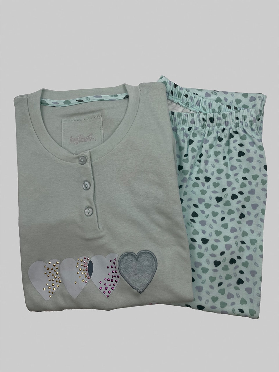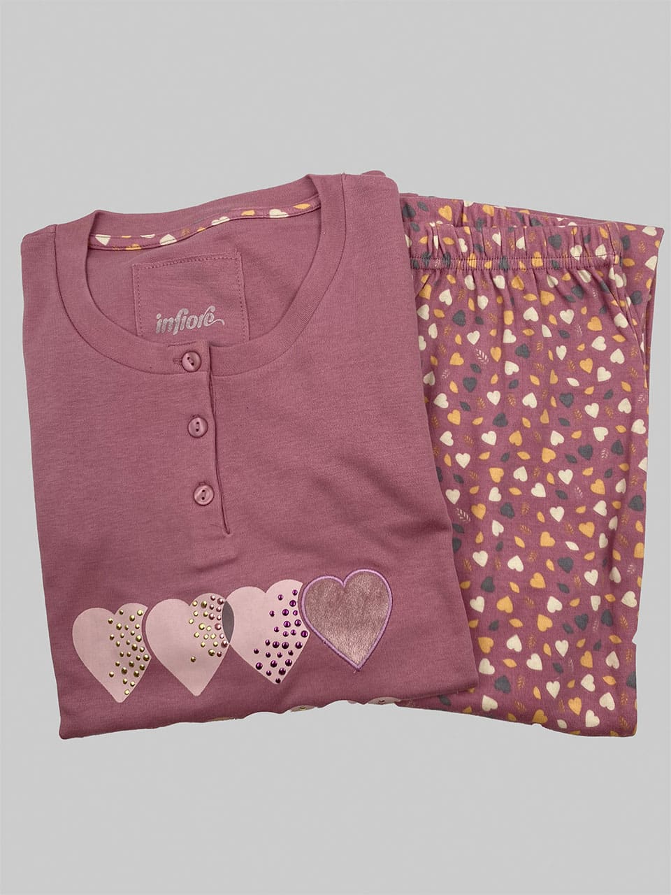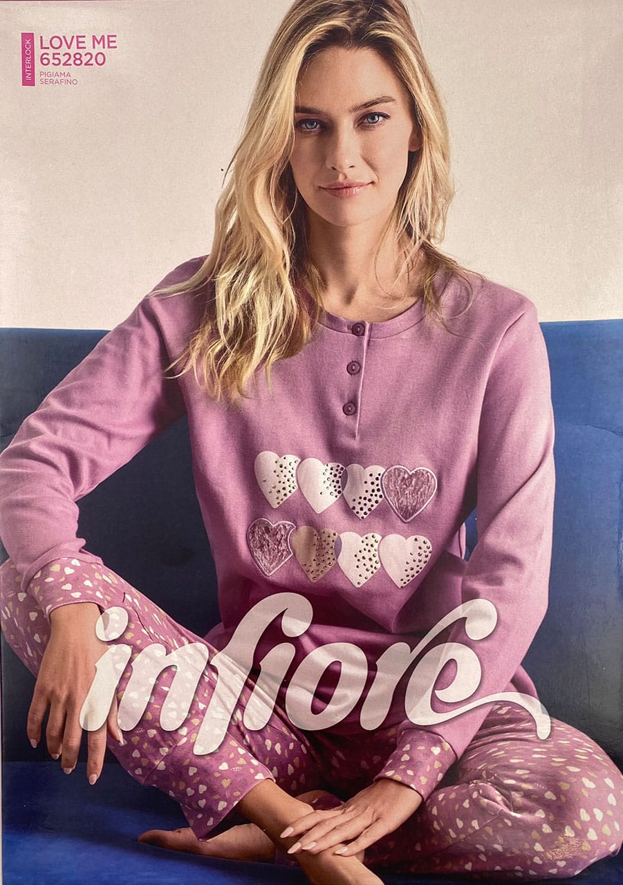 Il raffinato Pigiama Infiore è la scelta perfetta per affrontare le notti fredde con stile e comfort, posizionandosi tra i migliori pigiami da donna invernali. La maglia tinta unita, decorata da grandi cuori stampati, regala un tocco romantico e moderno, mentre i pratici bottoni sul collo offrono una vestibilità comoda e regolabile.