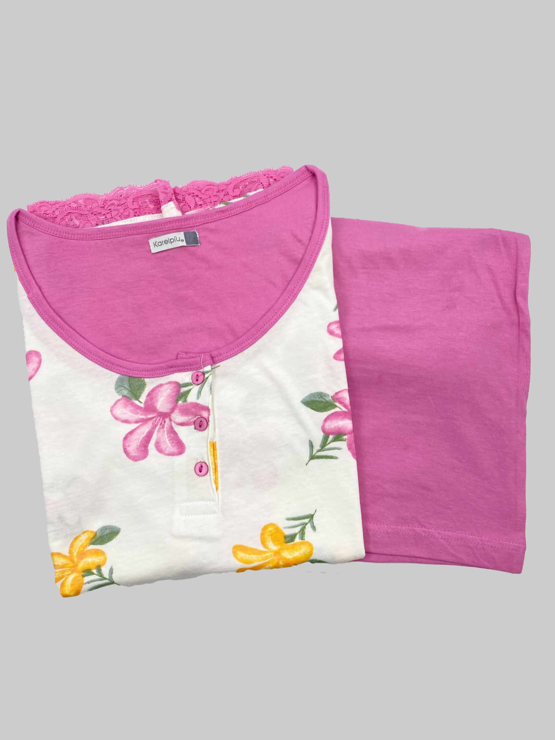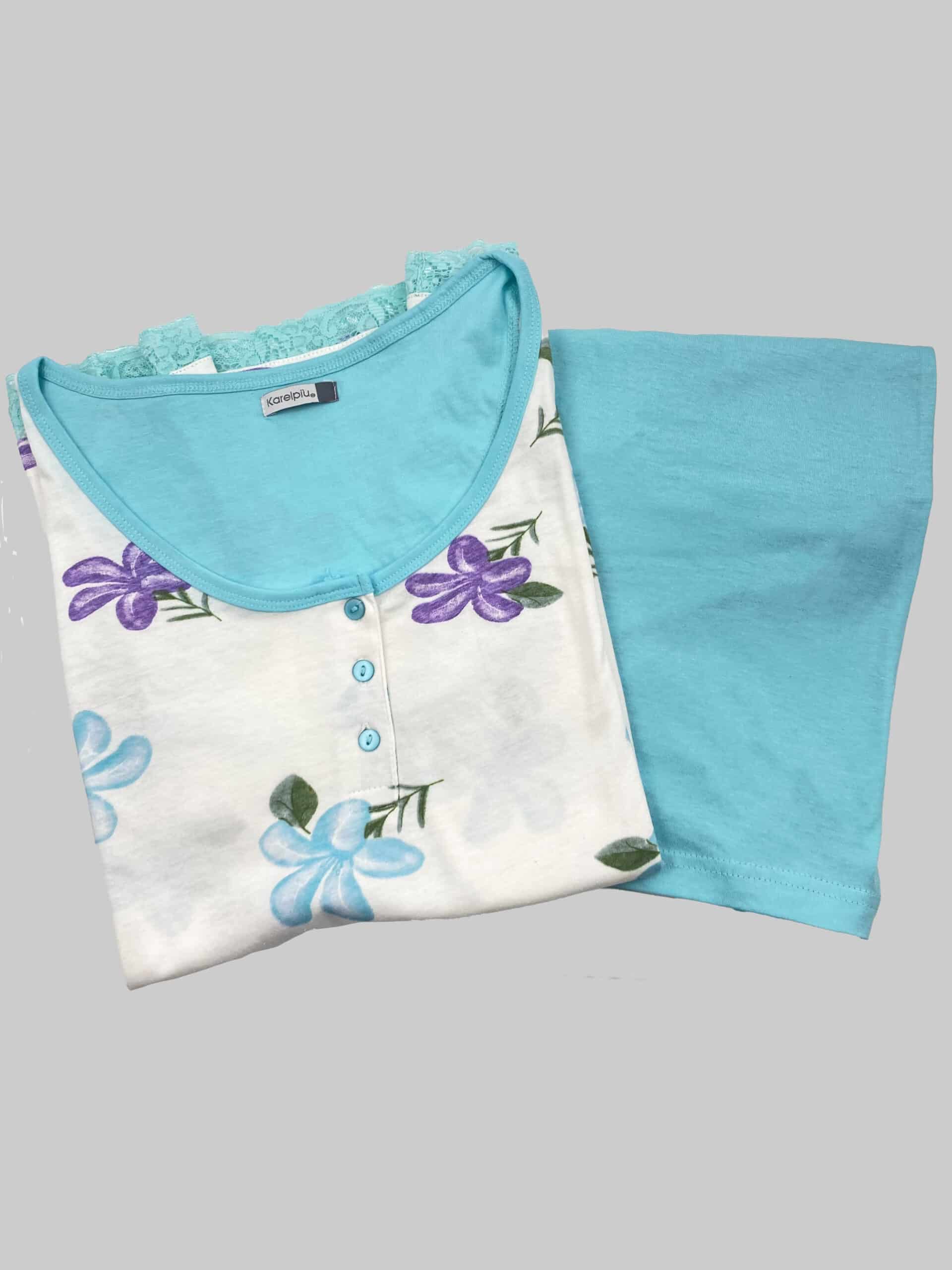 Pigiama donna estivo corto Karelpiù KC8300 è la scelta perfetta per chi cerca comfort e freschezza durante le notti estive. Realizzato in tessuto leggero e traspirante, è ideale per offrire il massimo benessere anche nelle giornate più calde. La canotta a spalla larga, impreziosita da una graziosa fantasia floreale, presenta una piccola apertura con bottoncini che facilita l’indosso, offrendo praticità e uno stile delicato.