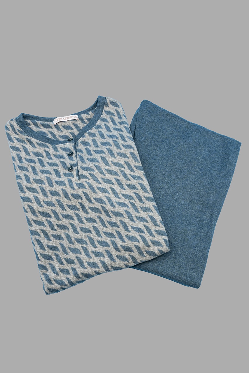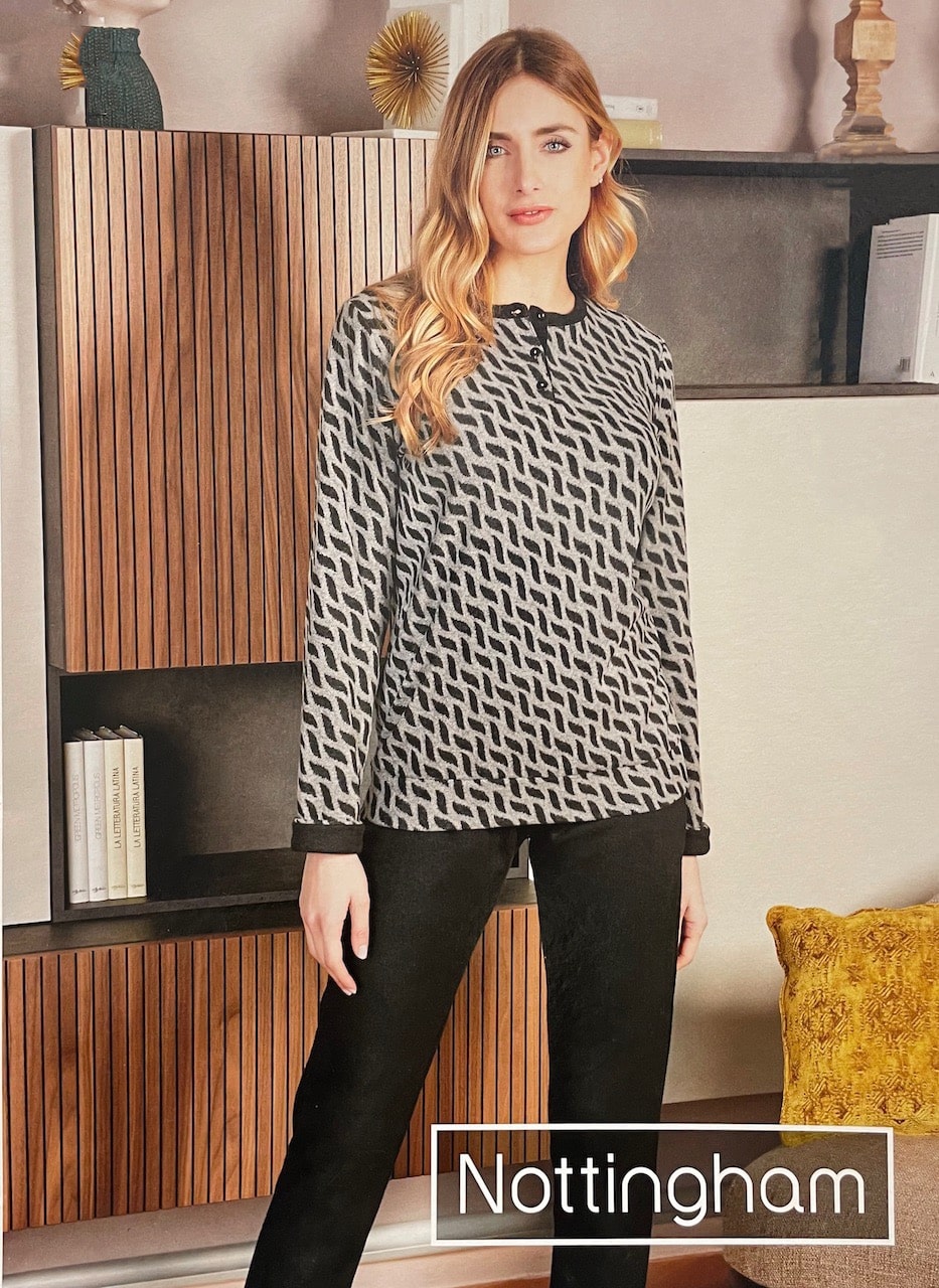 Pigiama donna invernale Nottingham 37998, la scelta perfetta per chi cerca comfort e stile nelle fredde serate invernali. Questo pigiama donna caldo della Nottingham è realizzato in caldo cotone e presenta un design pratico con bottoni. La casacca ha un’elegante stampa geometrica, mentre il pantalone è in tinta unita, per un look moderno e raffinato.