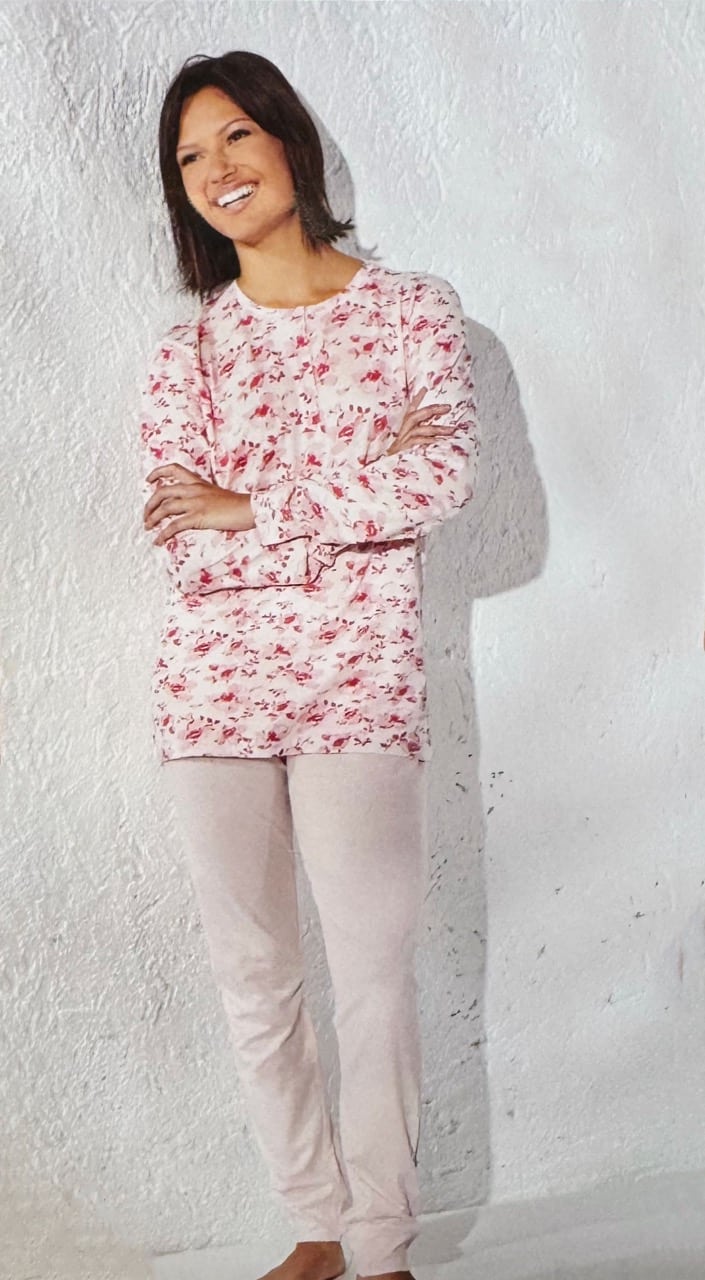 Il modello presenta una maglia con apertura a serafino, pratica e confortevole, che permette una vestibilità perfetta. Le maniche lunghe lo rendono adatto anche alle serate più fresche, garantendo una piacevole sensazione di benessere sulla pelle. Il pantalone, in tinta unita, completa il look con semplicità ed eleganza. Disponibile nei colori cielo e rosa e nelle taglie dalla M alla XXL, questo pigiama donna si adatta a diverse fisicità, offrendo libertà di movimento senza rinunciare allo stile.