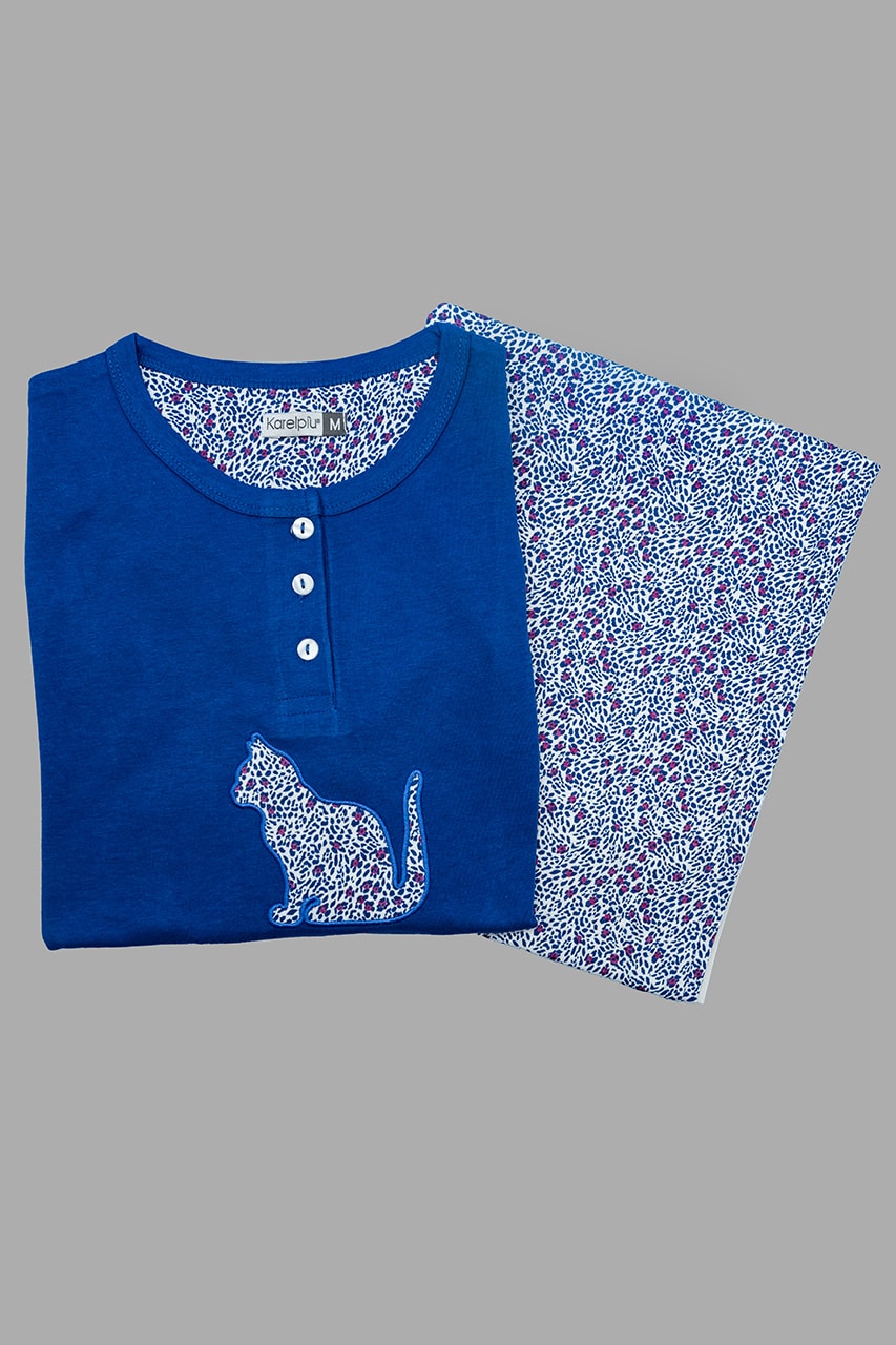 Pigiama estivo donna in cotone Karelpiù KC6110: il compagno perfetto per le tue notti estive! Comodo, fresco e alla moda, questo pigiama unisce stile e praticità, grazie alla sua composizione in cotone, che assicura comfort e traspirabilità anche nelle notti più calde. Ideale per chi cerca un capo che sappia coniugare semplicità e cura del dettaglio, con una casacca tinta unita impreziosita da una simpatica stampa di un gatto, abbinata a pantaloni con una delicata microfantasia. Questo pigiama di cotone donna è perfetto per chi ama sentirsi a proprio agio senza rinunciare allo stile.