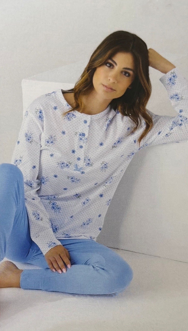 La maglia ha un’apertura a serafino, arricchita da una delicata fantasia floreale, mentre il pantalone è tinta unita, garantendo uno stile raffinato e armonioso. Grazie al tessuto in cotone, questo pigiama lungo donna è traspirante e morbido sulla pelle, assicurando una vestibilità comoda.