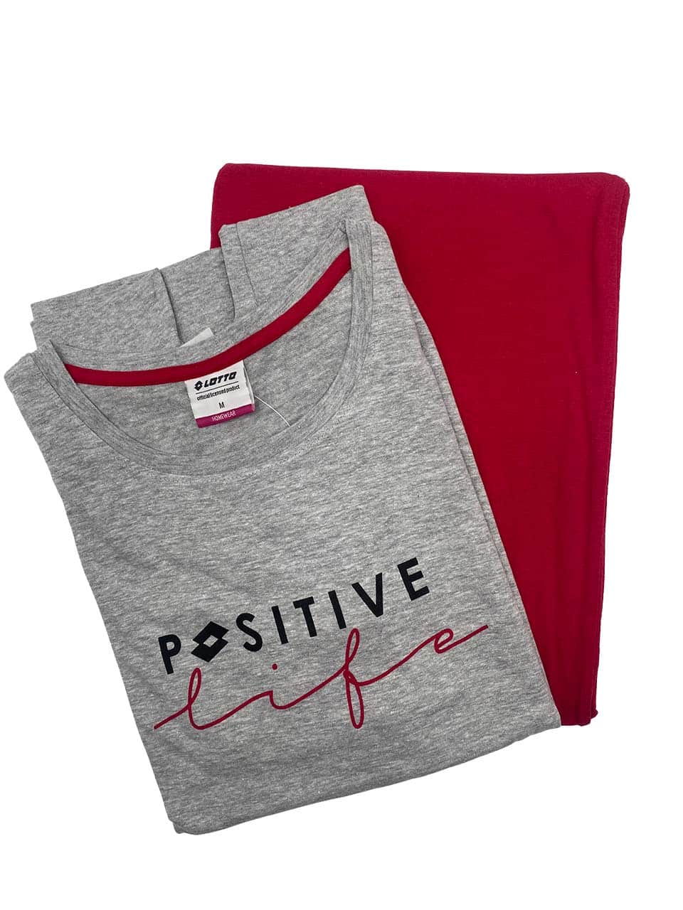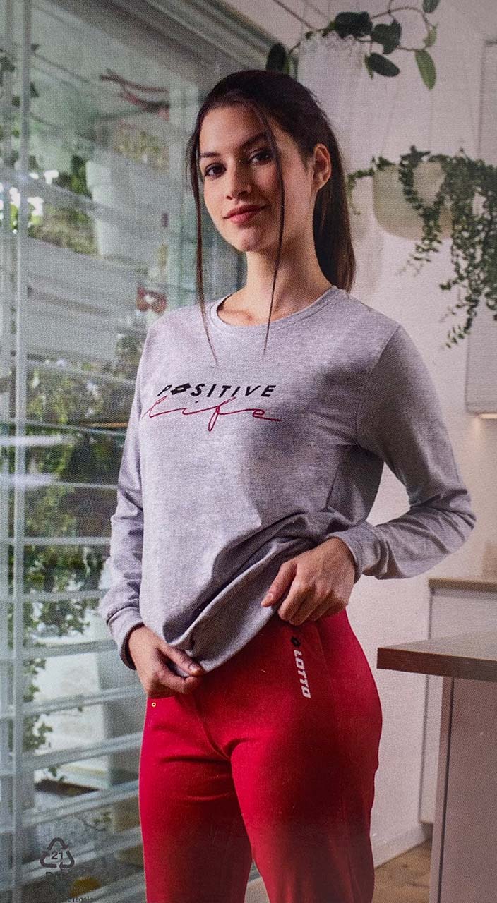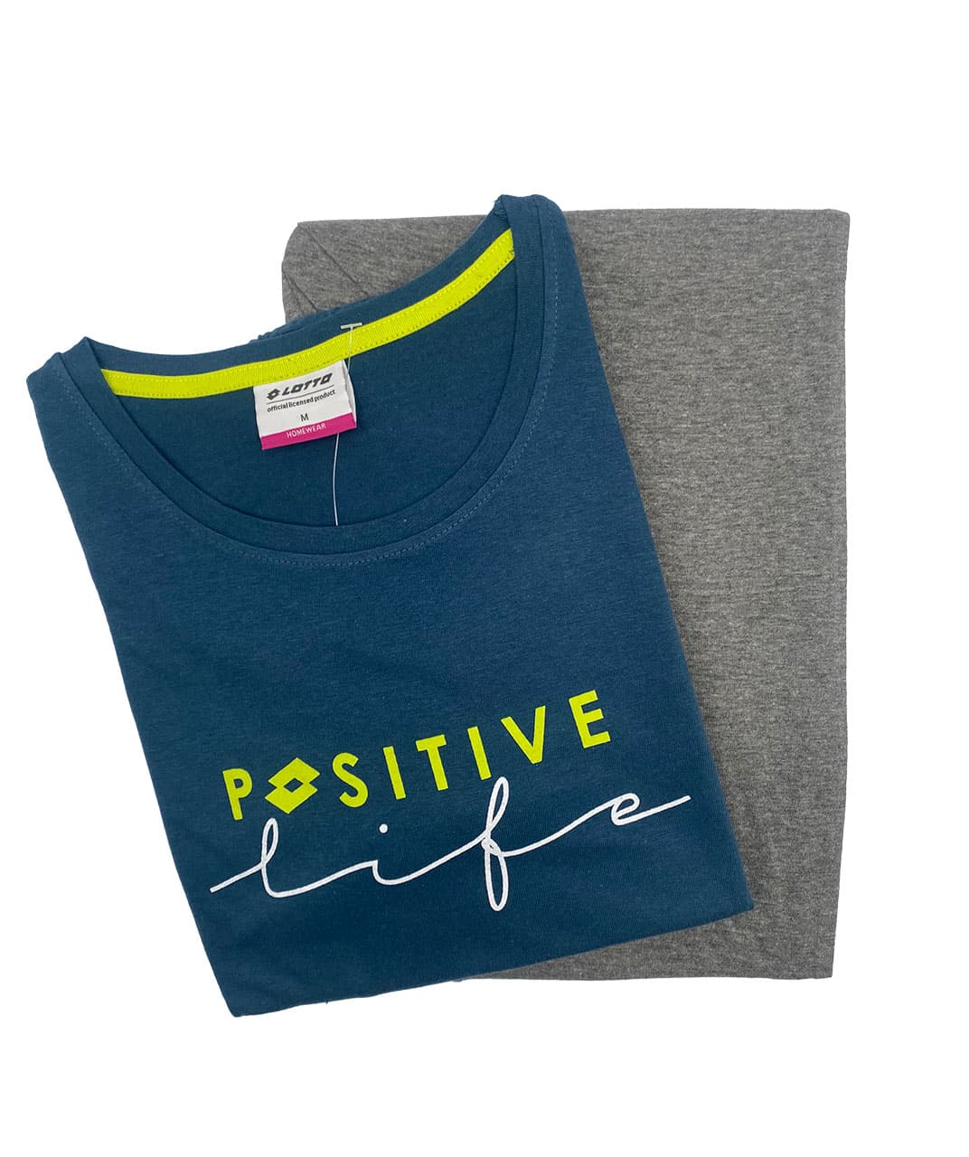 Questo pigiama Lotto donna è composto da una maglia girocollo tinta unita con scritta motivazionale colorata, semplice ma distintiva.