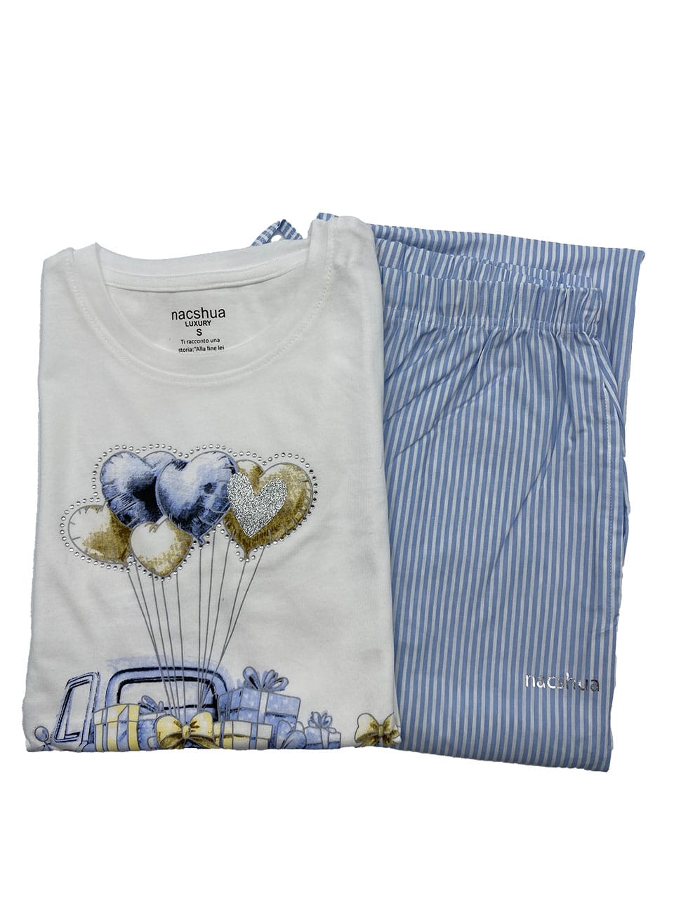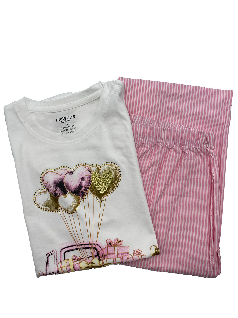 Pigiama estivo donna Nacshua Andreana in cotone 100%, girocollo con stampa retrò e strass, pantaloni rigati. Fresco, comodo e ideale per l’estate.