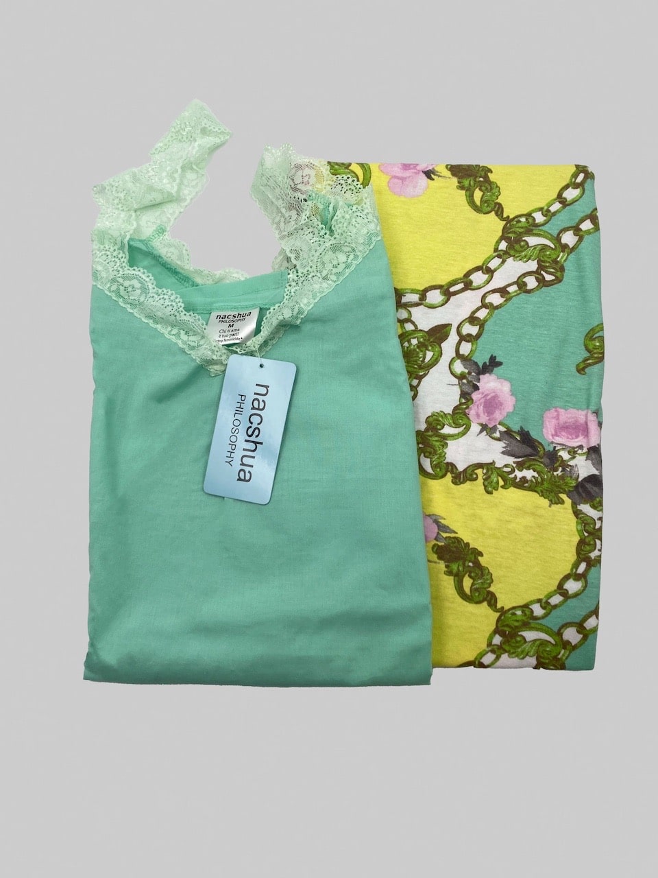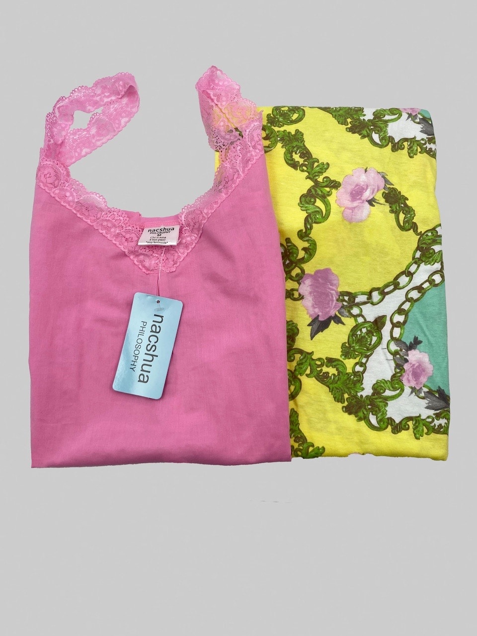 Il pigiama estivo donna Nacshua Mora è la soluzione ideale per chi cerca comfort e stile nelle calde notti estive. Realizzato in 100% cotone, è perfetto per chi desidera un pigiama donna cotone morbido e traspirante. La parte superiore è una canotta delicatamente rifinita in pizzo, che aggiunge un tocco di eleganza al tuo look da notte. Il pantalone lungo, a fantasia vivace, è dotato di pratici polsini, per un comfort totale durante il riposo.