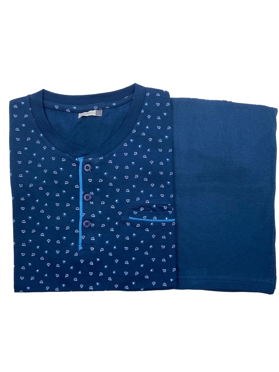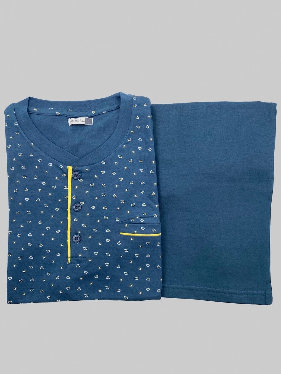 Pigiama Karelpiu uomo corto in cotone KC8213 è il pigiama ideale per l’estate, progettato per offrire comfort e freschezza. Realizzato al 100% in cotone, questo pigiama uomo è perfetto per le calde notti estive. La maglia con manica corta in microfantasia e la piccola apertura con bottoncini aggiungono un tocco di stile, mentre il pantaloncino corto a tinta unita con elastico in vita garantisce una vestibilità comoda e pratico.