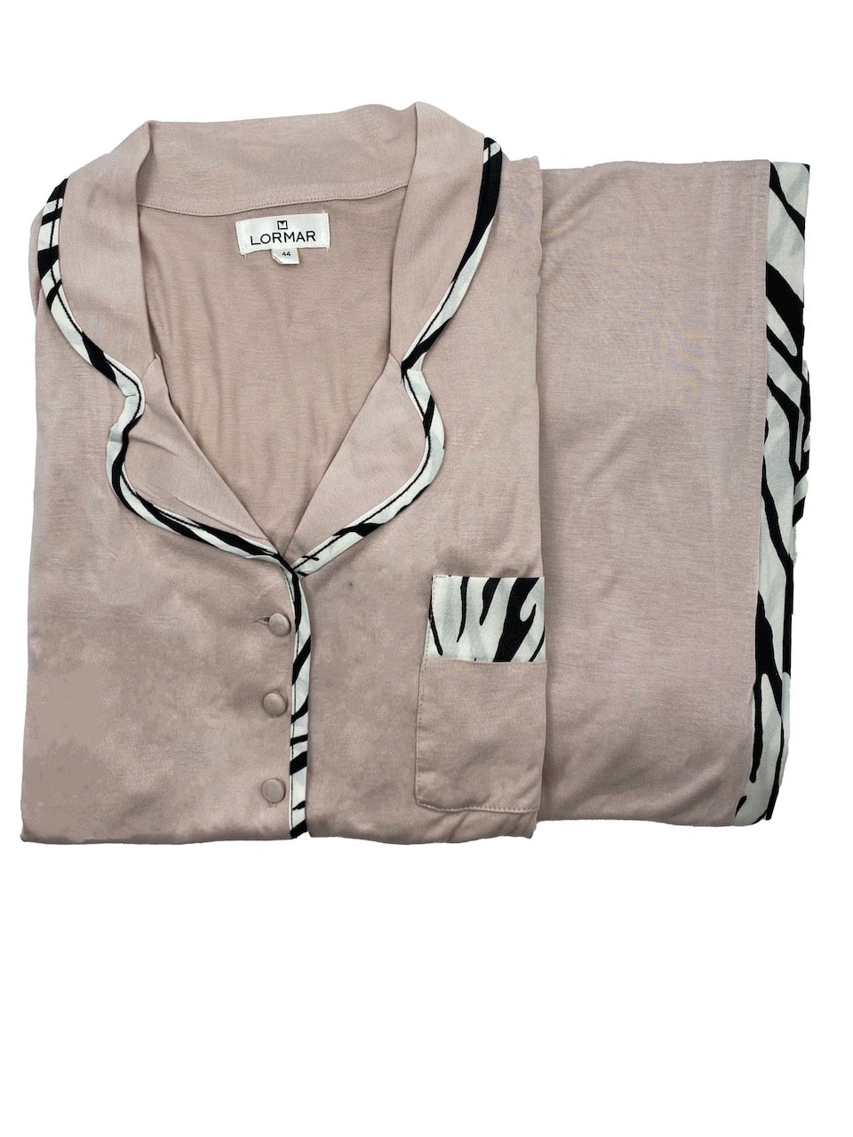 La maglia ha maniche corte, un colletto elegante e un taschino laterale, con apertura frontale a bottoni per una maggiore praticità. Il pantalone lungo completa il set, mentre la stampa animalier dona un tocco di originalità e stile. Perfetto per chi cerca un pigiama estivo donna di qualità e dallo stile sofisticato.