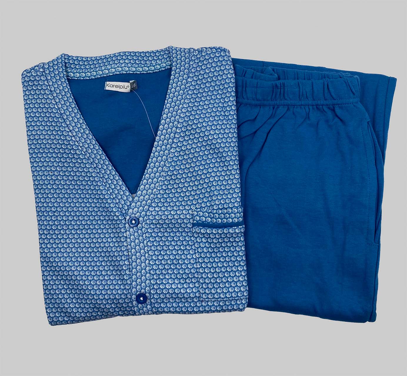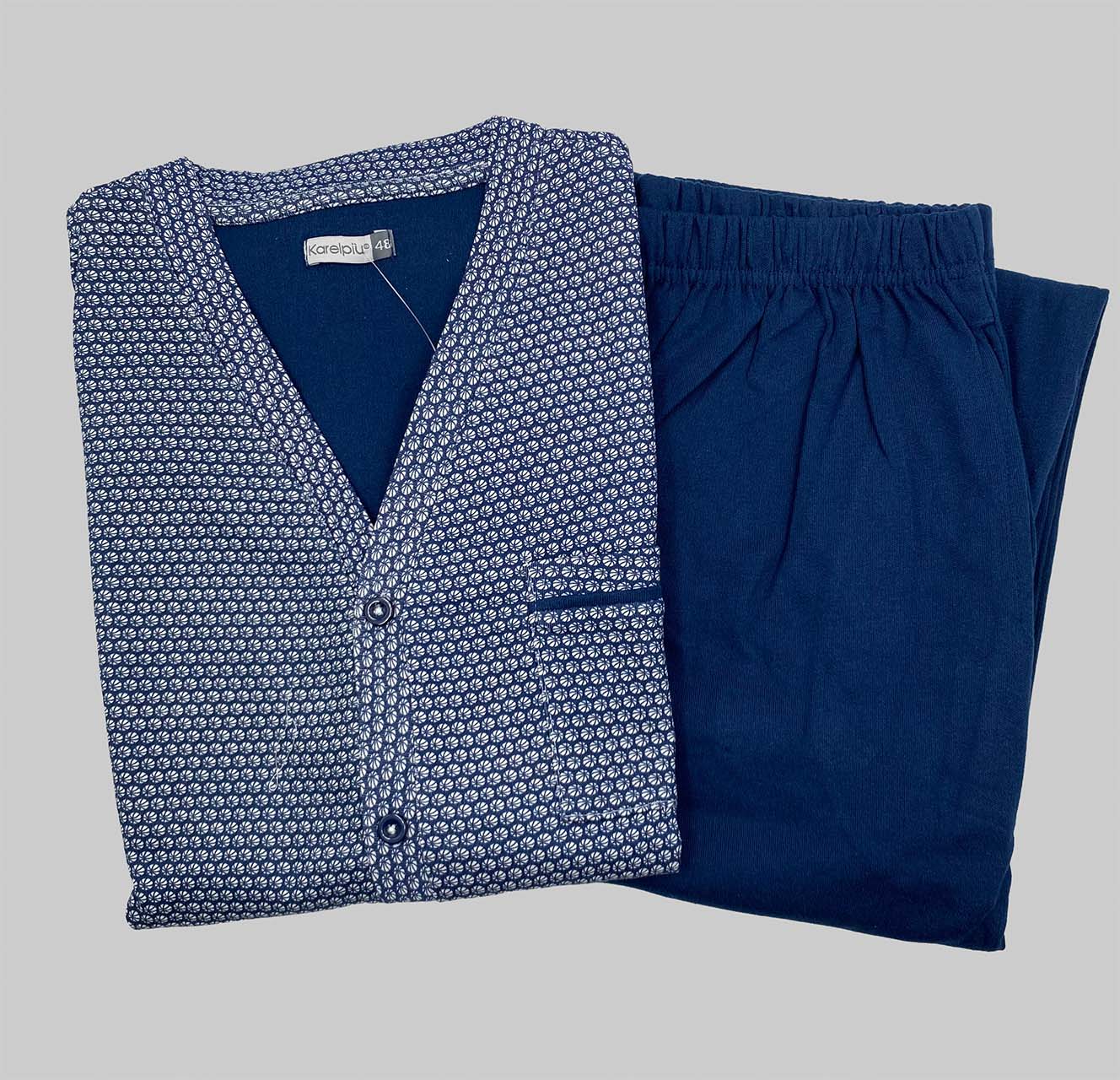 Pigiama uomo aperto davanti invernale Karelpiù, in caldo cotone 100%, con maglia fantasia abbottonata e pantaloni tinta unita, ideale per notti calde, comode e di stile.