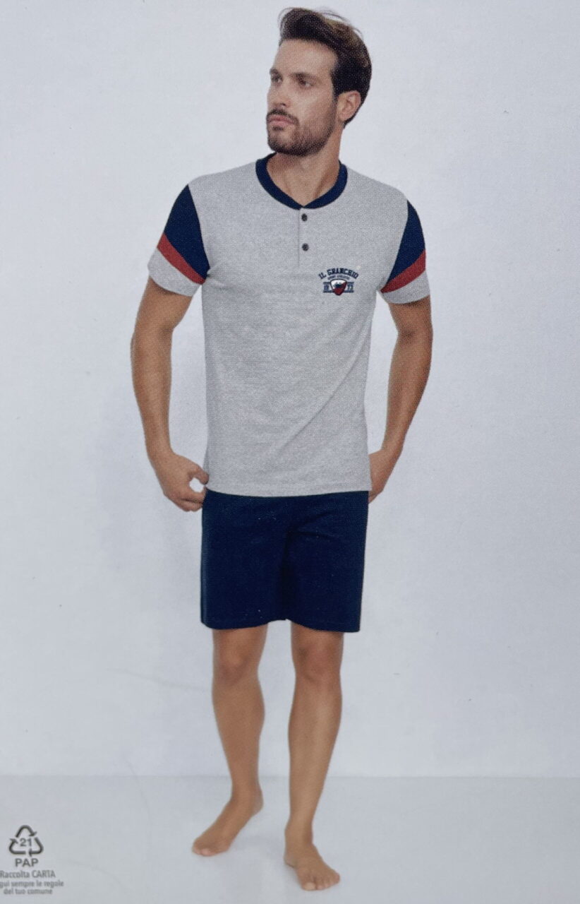Pigiama uomo corto in cotone Il granchio GP1052: perfetto per le notti estive, questo pigiama uomo cotone è realizzato in tessuto leggero e traspirante, ideale per affrontare il caldo con comfort. Il design a serafino con bottoni sul collo e la casacca tinta unita offrono un look casual ma elegante, mentre il pantaloncino assicura freschezza per tutta la notte.