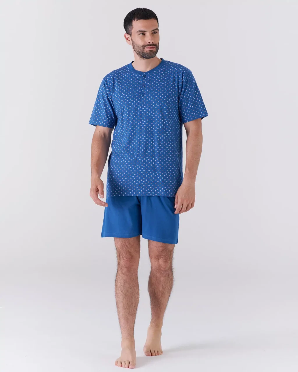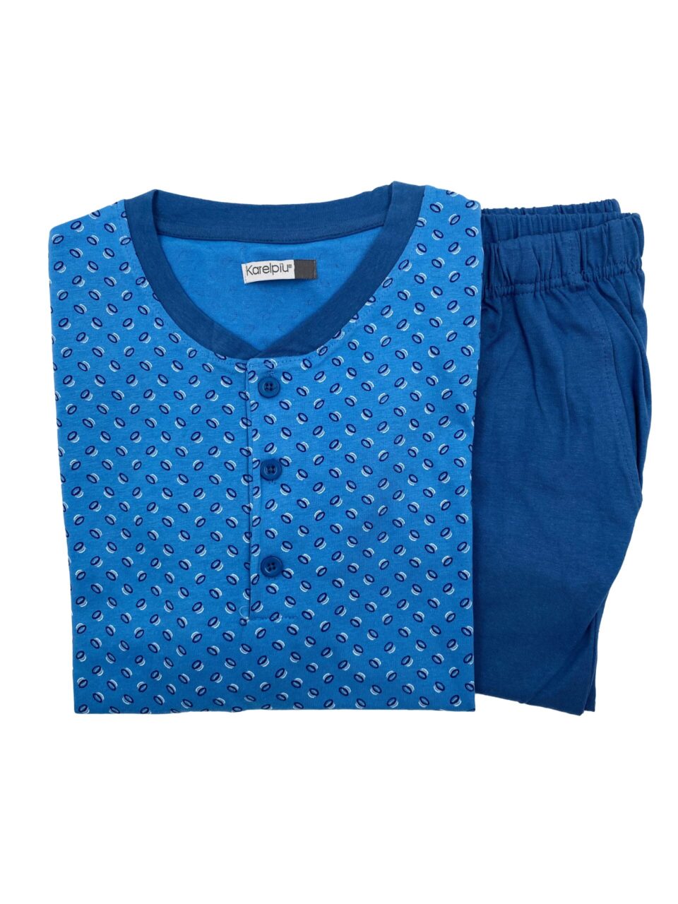 Pigiama uomo corto in cotone Karelpiù KC6195: perfetto per le calde notti estive, questo pigiama è pensato per offrirti il massimo del comfort e della freschezza. Realizzato in cotone, è ideale per chi cerca pigiami leggeri e traspiranti. Il design a serafino con i bottoni sul collo aggiunge un tocco di stile casual ma elegante, mentre la casacca con piccoli disegnini e il pantaloncino tinta unita rendono questo pigiama estivo uomo versatile e piacevole da indossare.