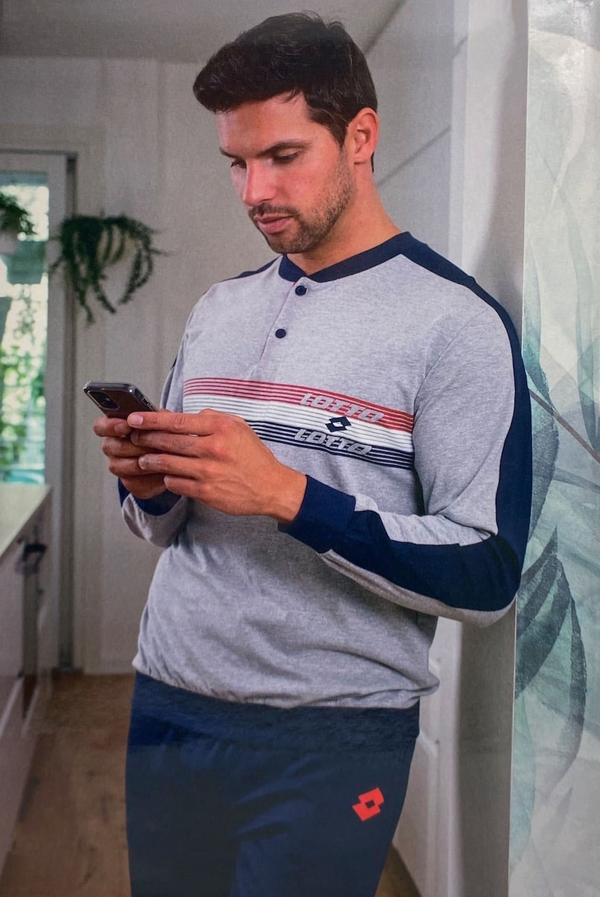 Pigiama uomo in cotone lungo Lotto LP1098, perfetto per chi cerca comfort e stile nelle notti primaverili ed estive. Questo pigiama lungo è pensato per offrire freschezza e libertà di movimento durante il riposo. Realizzato in cotone leggero, è ideale per le temperature più miti.