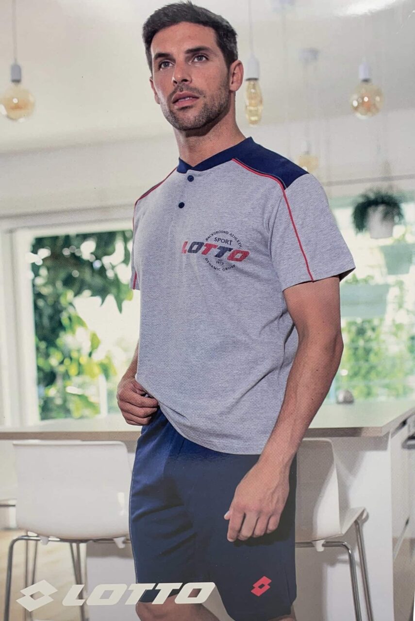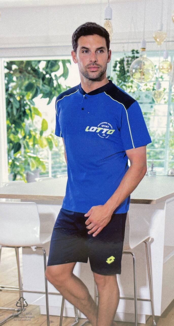 Pigiama uomo taglie forti corto in Lotto LP1113C: il pigiama perfetto per le notti calde, pensato per chi cerca comodità e stile in ogni stagione. Realizzato in cotone leggero, questo pigiama estivo uomo ti garantisce freschezza e morbidezza sulla pelle. Il design a serafino con bottoni sul collo e la casacca fantasia offre un look casual ed elegante, mentre il pantaloncino tinta unita assicura comfort.