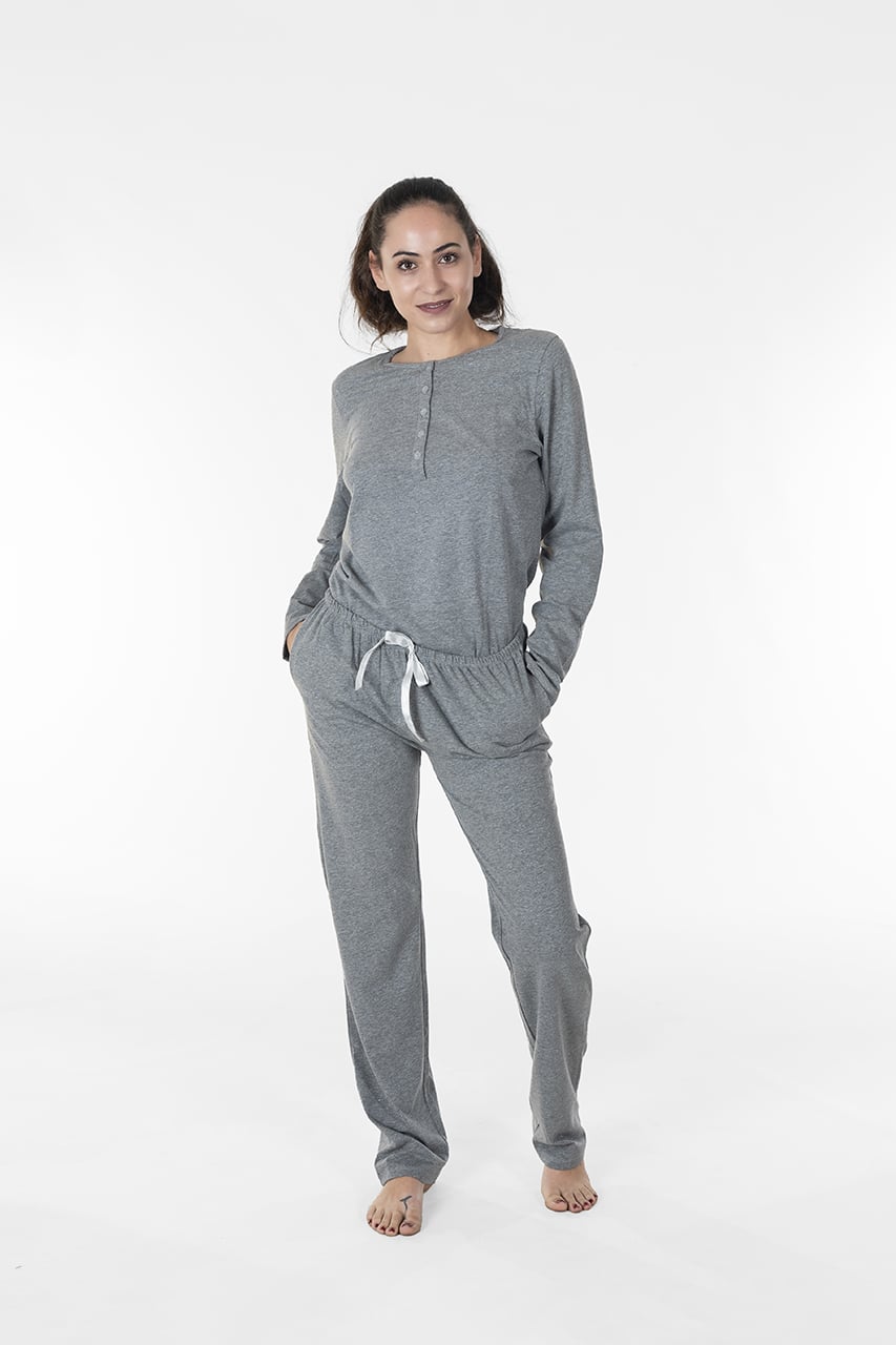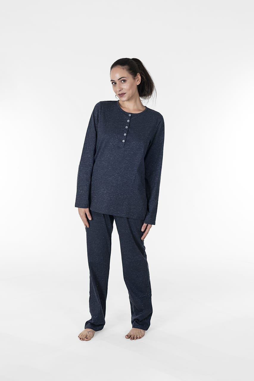 La maglia a serafino con bottoni sul collo presenta un design raffinato, valorizzato dal tessuto melangiato con leggero effetto lurex, che aggiunge un tocco di luce e femminilità. I pantaloni abbinati, in tinta unita, sono dotati di comoda chiusura con coulisse, per una regolazione semplice e precisa.